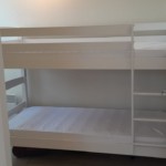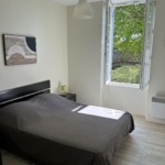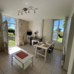 De plein pied donnant, cet appartement donne sur un jardin privatif. Le logement est composé d’un séjour-coin repas comprenant une cuisine équipée avec plaques chauffantes, réfrigérateur, lave-vaisselle, meubles de rangement, table, chaises et un canapé. Il dispose également de deux chambres, l’une avec un lit de deux personnes et une commode, l’autre avec un lit superposé et une commode. La salle d’eau comprend douche, lavabo et toilettes.